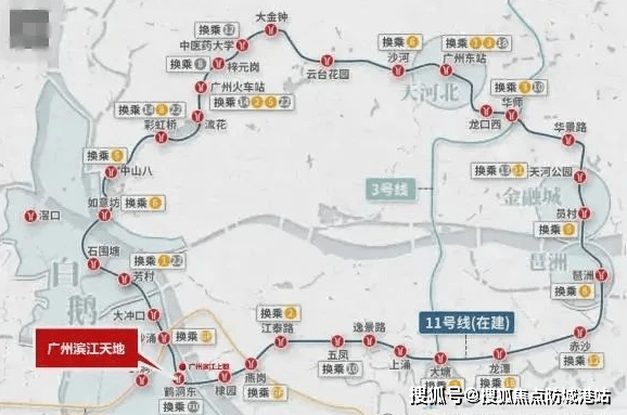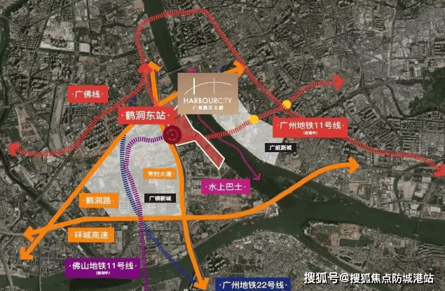 项目拥有便捷的TOD立体交通网络,集1轨道 + 2地铁 + 2高速 + 水上巴士于一体。广州11号线以及佛山11号线鹤洞东站双地铁上盖,11号线全长44.2km,共设32个站点,途径天河、白云、越秀、荔湾和海珠等5个重要区域,并连接广州火车站、广州东站等交通枢纽,极大地方便了居民与城市各重要区域的连接。此外,3横2纵大路网、公交站场以及水上巴士,形成水、陆、轨多维交通方式,构建起半小时城央生活圈与1小时湾区生活圈,为居民的日常出行、商务活动以及湾区内的交流往来提供了高效便捷的交通条件。