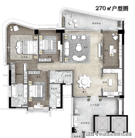 A户型为270㎡环幕江景四房,堪称王牌户型,配备约9米超大邮轮式阳台,一线望江无遮挡,专梯专户设计保障私密性。墅级空中双花园与约28㎡私家庭院,拓展生活空间;约42㎡超大主卧搭配270°环幕江景,阔绰双主套房设计,满足高端居住需求。