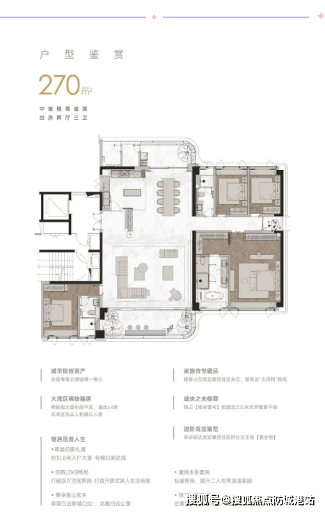 项目提供了多种户型选择,涵盖140-264平方米的大平层住宅以及50-277平方米的公寓产品。其中,大平层住宅采用了LDKB一体化方厅设计,南向双开间阳台,专梯专户,营造出宽敞舒适的居住环境。亮点户型如200平方米的单位设有3.4米层高及私家空中庭院,而264平方米的户型则配备了定制藏馆和中西双厨,满足高端客户的收藏与社交需求。