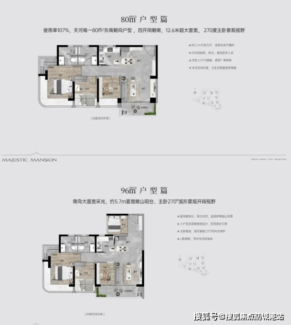 A:项目在售户型为建面约80-125㎡的全南向三至四房。作为第四代新规住宅,户型使用率超100%,得房率极高,空间利用率最大化。