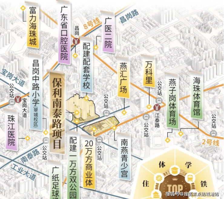 保利南泰路地块交通条件优越,依托立体化交通网络,实现城市快速通达。步行约400米即可到达地铁8号线宝岗大道站D口,未来北侧还将新增地铁出入口,使步行距离缩短至约300米。周边另有地铁2号线江泰路站、8号线昌岗站及11号线燕岗站,轨道交通网络密集,方便居民快速前往天河、琶洲、珠江新城等核心商务区。