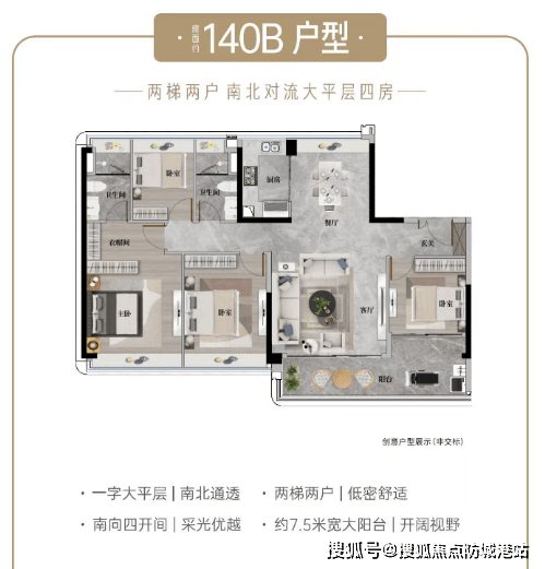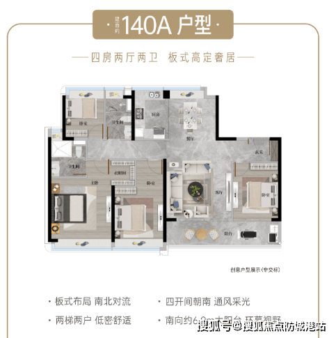 建面约140a㎡高定四房:高层景观视野佳,板式布局,南北对流,阳光充足。