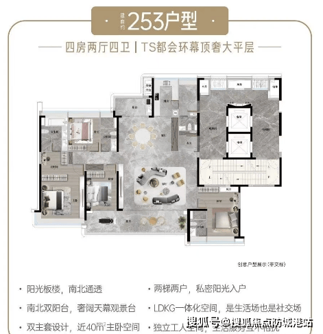 建面约253㎡定奢五房:限量级CBD低密板式高层,双阳台设计,近10.3米宽巨幕阳台,尽显奢华品质。