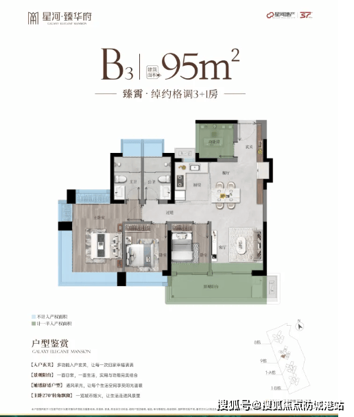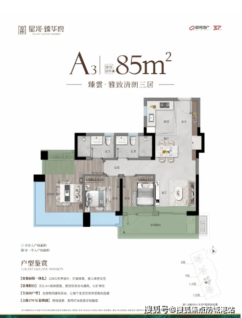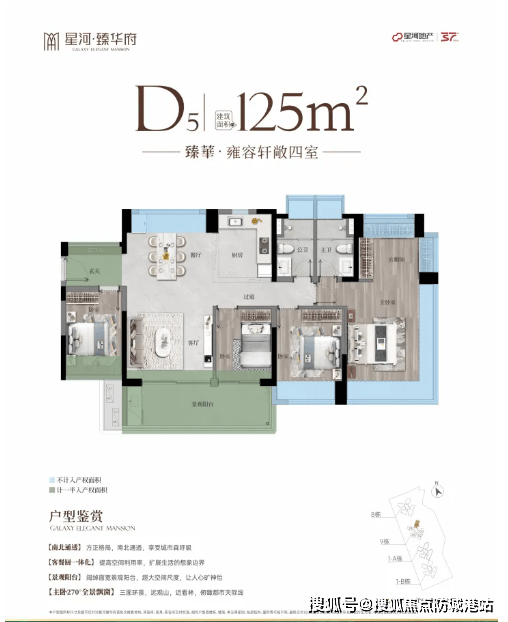 星河臻华府户型设计遵循新规,实用率接近100%,所有住宅户型均朝南,实现光照充足与舒适通风。首开楼栋包括1号楼及9号楼,2梯5户布局为主,户型面积从85平方米三房至125平方米四房不等。