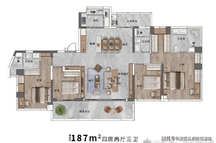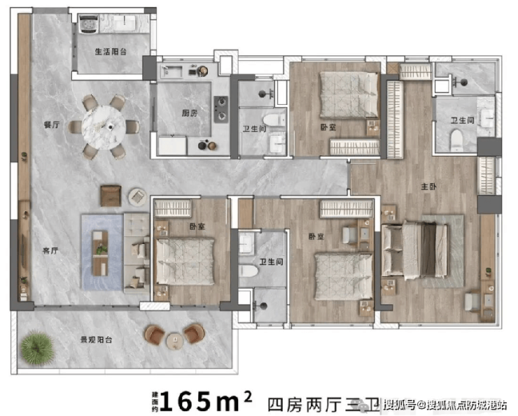 天赋龙湾当前主推111–188㎡四房产品,精准切中改善家庭“一步到位”的需求。以热销的111㎡四房为例,做到南向四开间、LDK一体化、主卧套房带飘窗,得房率超80%,在同面积段极具竞争力。而143㎡以上户型更引入270°转角观景阳台、双主卧设计、独立家政区等高端元素,部分楼栋可直瞰东平河一线江景,视野无遮挡。所有户型均强调“动静分区”与“全明通透”,即便是最小面积也保证四房两卫,实用性极强。值得一提的是,项目采用“高低配”布局,西苑楼栋普遍为18–25层,既保障采光通风,又避免超高层带来的压抑感。在170万起的价格门槛下,能买到如此尺度的四房江景改善产品,在整个佛山主城区几乎绝无仅有。