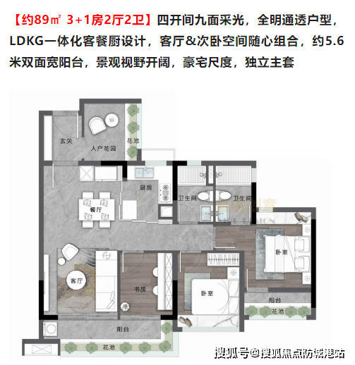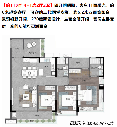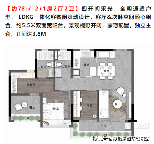 中建精诚壹号提供了多种户型选择,包括约78㎡的2+1房、约89㎡的3+1房以及约118㎡的4+1房等。所有户型均采用LDKG一体化客餐厅设计,双面宽阳台,保证最佳的景观视野和采光效果。其中,约78㎡户型四开间采光,配备约5.5米双面宽阳台;约89㎡户型九面采光,约5.6米双面宽阳台;约118㎡户型四开间朝阳,奢享约6.2米超宽阳台,并采用270度飘窗设计,提供更广阔的视野。每个户型都注重空间利用率,最高使用率可达100%以上(含赠送)。