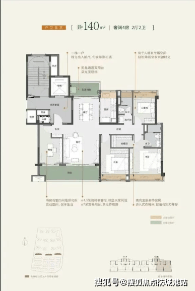 140㎡户型(12座专梯专户):专梯专户设计,保障了业主的隐私与尊贵感。17层的小高层建筑,居住密度较低,140㎡的空间能够打造豪华舒适的居住环境。
