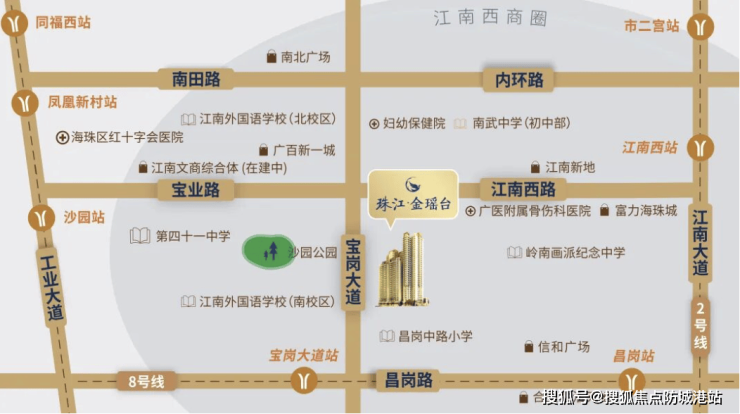 珠江·金瑶台坐落于广州海珠区宝岗大道板块,属于江南西商圈的重要生活区域。该区域一直以来都是海珠区人口密集度较高、商业活跃度较强的板块之一。项目所在位置位于宝岗大道与周边传统街区之间,既能享受繁华商圈带来的生活便利,也能够保持一定的居住安静度。