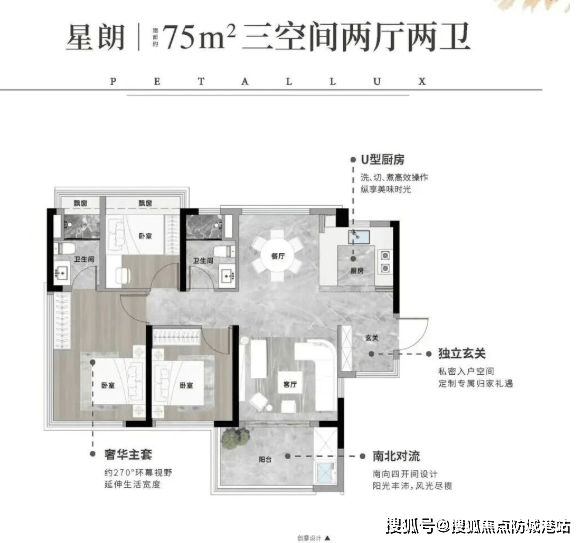 75㎡三房两卫户型,巧妙规划南北通透格局,配备独立玄关,不仅动线流畅,更让每一寸空间都物尽其用。实际使用面积高达约88㎡,相当于市面上110㎡二手三房的居住体验,却以更低总价轻松拥有。对于预算有限但又渴望三房生活的年轻家庭而言,这是极具性价比的选择。