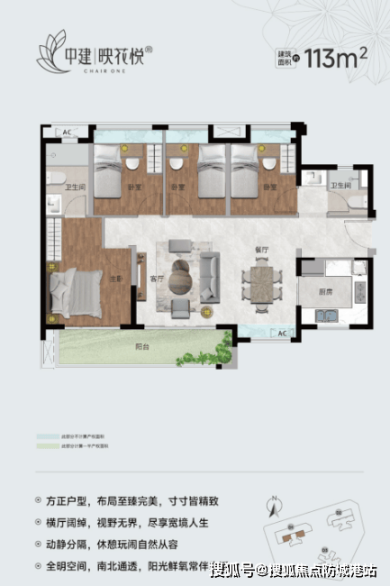 113㎡四房两厅两卫:IMAX全景奢阔户型,横厅设计,动静分区合理,是大家庭的理想之选。