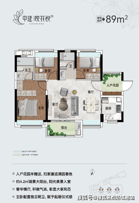 89㎡三房两厅两卫:带入户花园,南北通透,主卧朝南带主套,提升居住品质。