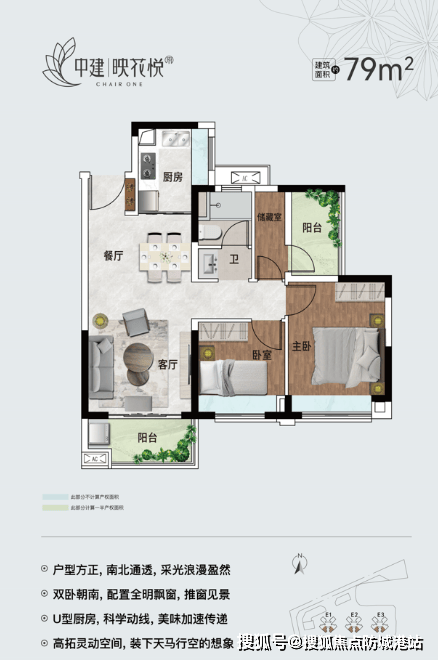 79㎡三房两厅一卫:南北通透,双卧朝南,U型厨房设计实用性强。