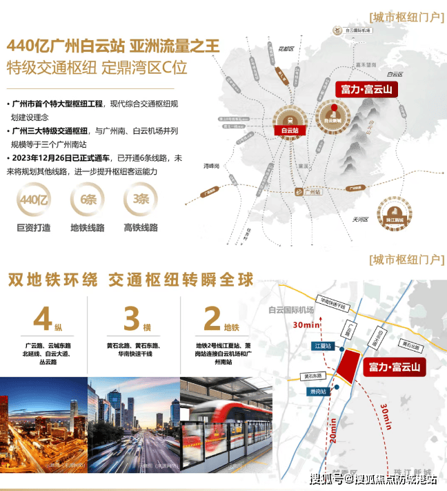 富力·富云山地理位置优越,距离江夏地铁站-C口仅679米,距地铁萧岗站不到1公里,周边3公里范围内拥有双地铁线路,广州白云站也仅3.5公里。这使得从项目出发15分钟即可抵达越秀老城区,20分钟直达珠江新城。此外,项目紧邻主干道和高速公路,无论是市内通勤还是省际往来,交通都十分便捷。