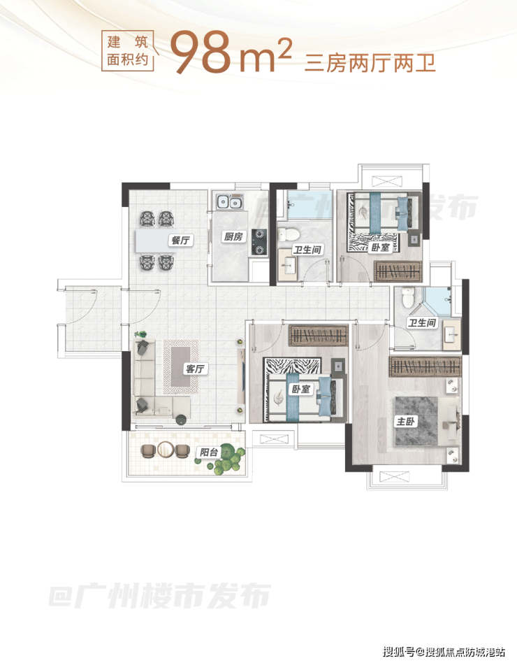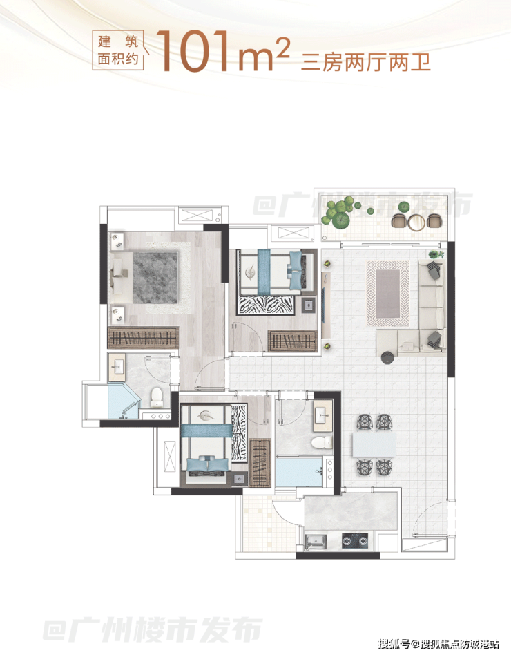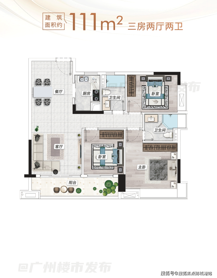 约101平三房采用竖厅布局,实现活动空间与休息空间的合理分区,客厅作为社交区域,聚会聊天、娱乐互动均不影响家人休息。主卧配备270°观景飘窗,最大化延伸景观视野,阳光与清风轻松入户,提升睡眠质量,让居家生活更具质感。约111平三房则在空间尺度上进一步提升,卧室与客厅空间更宽敞,适合人口较多的家庭居住,兼顾私密性与实用性。