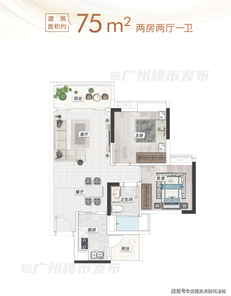 约75平实用两房,专为刚需家庭打造,是上车海珠城芯的优选户型。客餐厨一体化设计,打破空间界限,让整体空间更显通透开阔,日常活动与用餐互不干扰。户型配备南北双阳台,景观阳台可种植花草、摆放休闲家具,打造专属小花园;生活阳台则可放置洗衣机、烘干机,兼顾收纳与实用,轻松解决居家收纳难题。该户型还能对望小蛮腰,闲暇时可欣赏城市景观,提升居住幸福感。