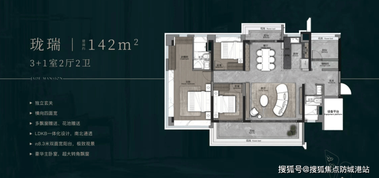 142-143㎡四房:双主卧分离布局,长辈房带独立卫浴,南向面宽达12米,7米长阳台采光通风俱佳。