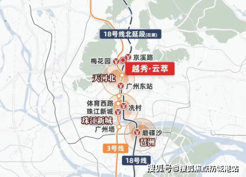 越秀云萃位于广州市中心的黄金位置,距离珠江新城仅5公里,自驾可通过广州大道或沙太路快速到达珠江新城CBD。项目是双地铁项目,家门口即为18号线京溪路站,可直达琶洲、珠江新城、天河北和万博等重要商圈。步行约800-900米可达3号线梅花园站,进一步提升了出行便利性。