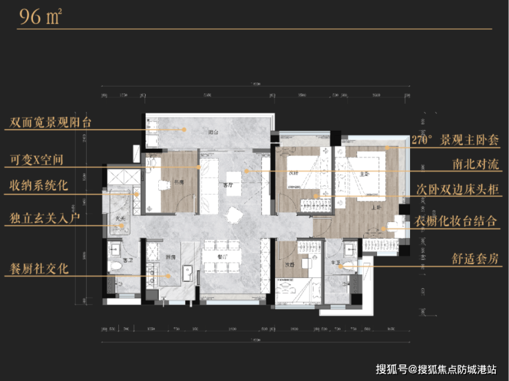 项目仅2栋住宅(31-32层),采用蝶式布局,实现户户朝南、户户错落、户户单边位,最大化采光通风与视野私密性。主力户型三大亮点: