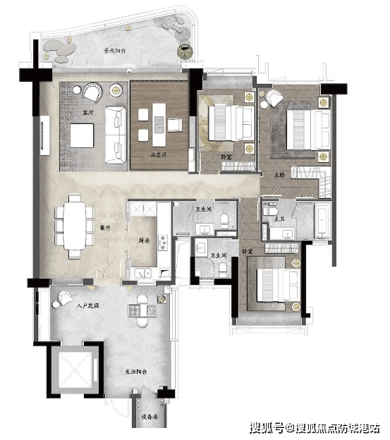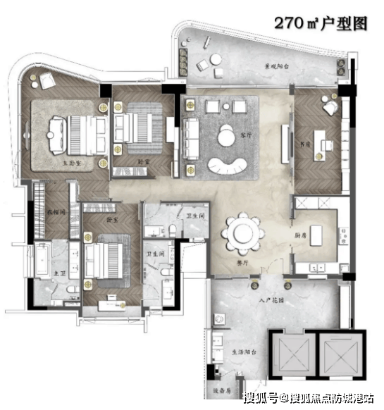 3. 约270㎡环幕江景四房(王牌户型):该户型为四房双主套设计,是高层洋房的王牌户型,一线望江无遮挡,270°环幕江景视野,空间阔绰,彰显高端圈层质感,适合高端改善、企业家等高端人群。户型采用专梯专户设计,尊享私密归家体验;客厅采用大面宽设计,连接约9米超大邮轮式阳台,可全景俯瞰三江汇聚江景,视野极佳,闲暇时可欣赏江景风光,营造大气舒适的居住氛围;墅级空中双花园设计,配备约28㎡超大私家庭院,打造多功能空间,可作为休闲区、花艺区或社交区,彰显圈层格调;主卧套房设计,约42㎡超大主卧空间,配备独立卫生间、步入式衣帽间和270°环幕江景飘窗,空间宽敞,私密性强,居住体验尊贵,可满足日常休息、储物、休闲等多重需求;另外三个卧室空间宽敞,均配备飘窗,可作为儿童房、客房或书房,灵活满足高端家庭的多元化需求;厨房为U型设计,操作空间充足,明厨设计,通风透气,与餐厅相邻,用餐便捷;公共卫生间干湿分离,配备独立洗手台,同时设有储物空间,提升使用便利性;户型整体装修标准高端,细节处理精湛,贴合高端人群的居住需求,是高端置业的首选户型。