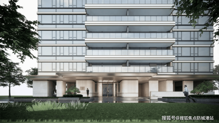 设计元素层面,从广府民居中的特色镬耳墙,提取柔美的造型弧形元素,结合越秀品牌标识,转译成极具标志性的“树状”造型,运用到塔冠及大堂门扇的造型中,寓意对美好生活的希冀与向往;丰富细节的墙身脊线,则转译为精工感十足的塔身层间线条;