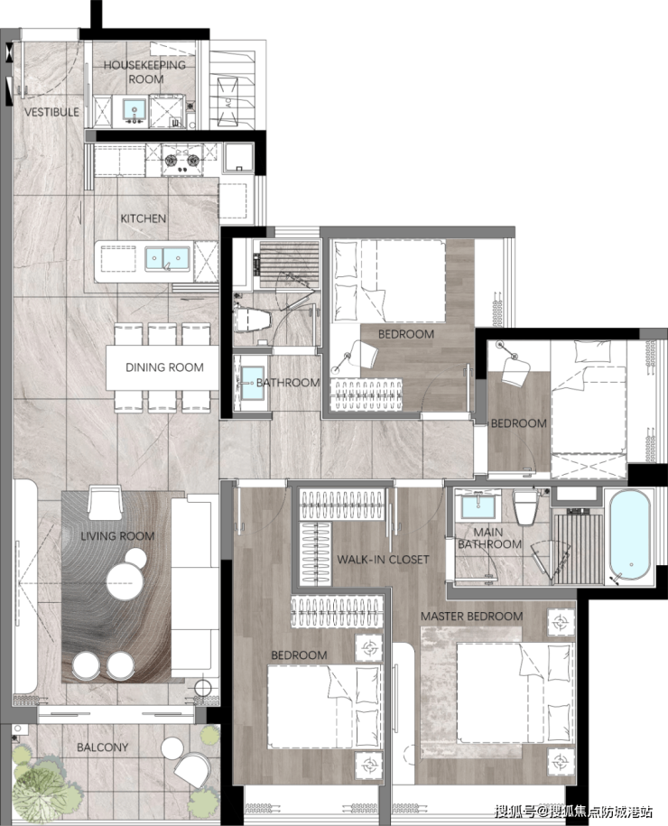 项目首推的户型面积段集中在125平方米至180平方米,全部设计为四房格局,这一定位非常明确地指向了多人口家庭的改善需求。以建面约129平方米的四室两厅两卫户型为例,其空间布局紧凑而实用,在保证四个房间独立性的同时,尽量扩大了公共活动区域的尺度。客厅与餐厅通常采用一体化设计,连接南向阳台,以引入更多的自然光线和景观视野。主卧套房设计配备了独立卫生间,提升了居住的私密性和舒适度。而在建面约140平方米的户型中,出现了横向厅的设计版本,这种布局进一步拓宽了采光面,使得客餐厅的空间感更加开阔,适合喜欢大横厅生活方式的家庭。至于建面约180平方米的四室三卫户型,则在功能分区上更为细致,三个卫生间的配置有效解决了早高峰时段家庭成员使用卫生间的冲突问题,双套房的设计更是满足了二代同堂或三代同堂的居住习惯。这些户型在设计上普遍强调了空间的灵活性和功能性,试图在有限的面积内挖掘出最大的居住价值。当然,受限于高容积率和地块形状,部分户型可能存在过道较长或部分房间面积紧凑的情况,购房者在实地看房时需结合家具摆放进行具体考量。