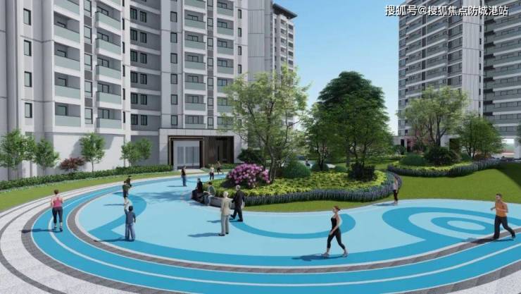 运动设施方面,项目环绕园林一周打造有长约650米的跑道,中央景观带中约900平度假泳池,以及活力HUB多功能活动场,从年轻人到长者的健身需求都能覆盖。