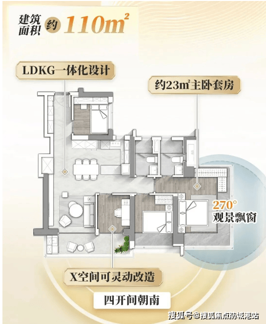 110-143㎡刚需改善型:三开间朝南,LDKG 一体化布局,动静分区明确,部分户型带观景阳台,满足三口之家或三代同堂基础居住需求;