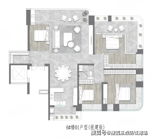 户型采用五房三主套的布局,贴合高端改善需求,三个主卧均配备独立卫生间和衣帽间,私密性和舒适度拉满,适合多孩家庭或三代同堂居住,每一位家人都能拥有独立的居住空间,避免了相互干扰。主卧面宽约5米,空间宽敞,配备大飘窗和独立衣帽间,同时能欣赏到一线江景,舒适度极高;另外两个主套房面积适中,适合老人和大孩居住,私密性有保障。