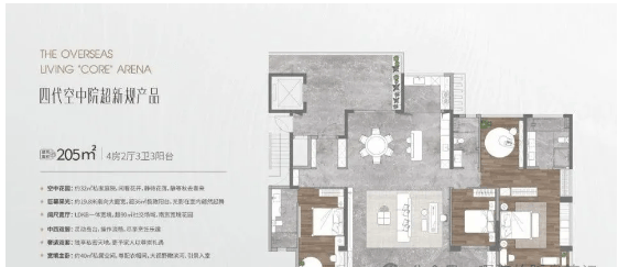 主打 132-205㎡四代空中庭院户型,采用围合式布局,规划 12 栋纯南向板楼,两梯两户、专梯专户设计,私密性与尊崇感拉满。户型设计亮点纷呈,户户配备私家庭院,部分户型含 6 米挑高露台,L 形大开间无界宽厅连接南向超大阳台,将海景风光引入室内。最高约 130% 的使用率,兼顾舒居、社交、亲子等多样需求,完美融合滨海自然与奢华空间。