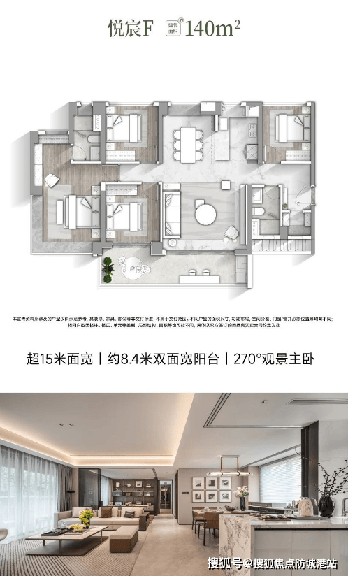 悦宸C户型(建筑面积约140㎡):四开间朝南,约7.7米双面宽阔景阳台。