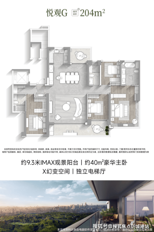 悦观G户型(建筑面积约204㎡):LDKG一体化设计,约9.3米南向IMAX观景阳台。