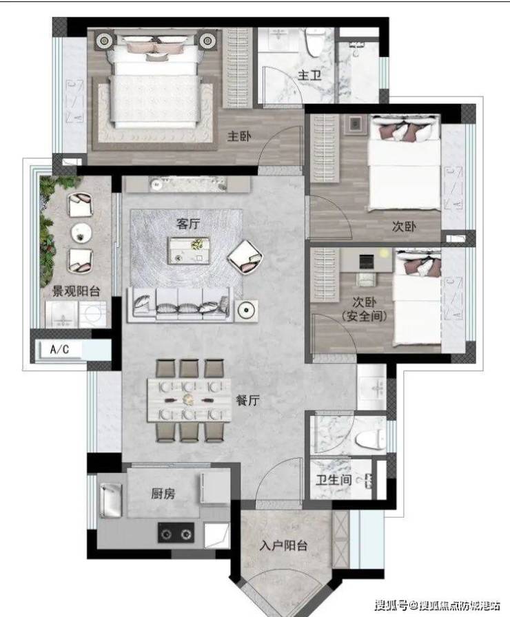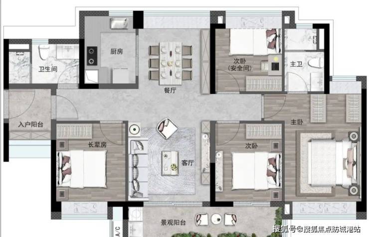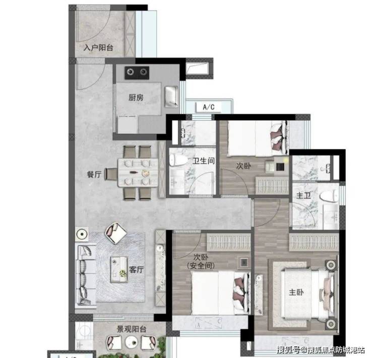 全屋共计6处赠送空间(4处一字型飘窗全送、入户花园、景观阳台送一半)