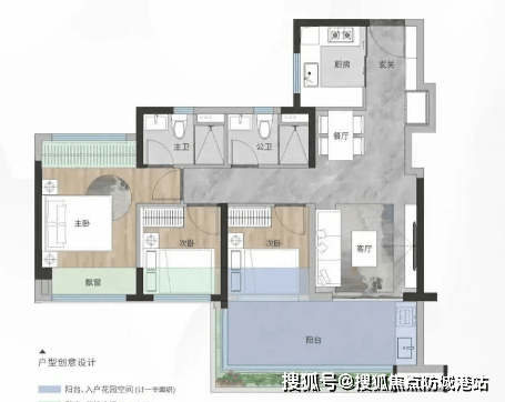 🏠87㎡三房两卫:阔绰玄关设计,一体化双厅设计,南向四开间,约5.8m宽幕阳台。
