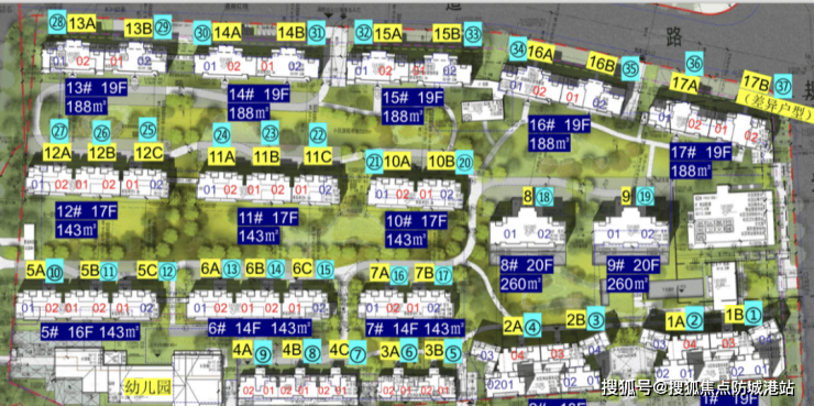 项目规模:总建面约18万㎡,容积率2.8,由8栋25-32层高层住宅及1所12班幼儿园组成,分两期开发