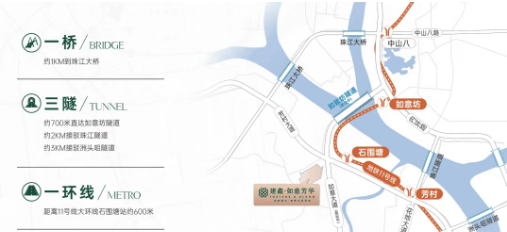 从交通角度来看,项目距离地铁11号线石围塘站仅约600米,步行8-15分钟即可到达。此外,该线路是广州首个大环线,途径多个中心区,换乘站多达14个,极大地提升了居民出行的便捷性。自驾方面,紧邻芳村大道,通过洲头咀隧道、内环路等快速通达天河、越秀等核心区域。