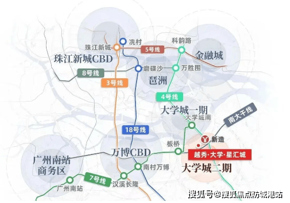 项目坐落于番禺国际创新城核心启动区(大学城二期),紧邻华南理工大学国际校区、暨南大学番禺校区,人文氛围浓厚。交通方面,小区东门开放后步行 800 米可达地铁 4 号线新造站,1 站到大学城、3 站达万博、4 站至琶洲、5 站抵金融城,30 分钟直达珠江新城,完美适配跨区通勤。自驾经南大干线 10 分钟到万博 CBD,通过已开通的金光东隧道无缝衔接大学城,1 小时内可抵达广州南站、白云机场,多维交通网络覆盖日常出行需求。