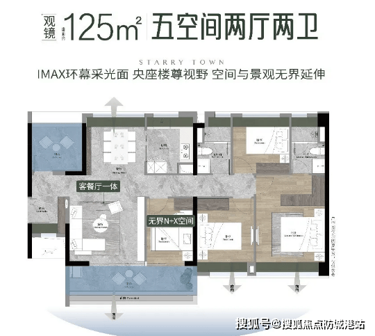 125㎡五房两卫:终极改善户型,4.5 开间朝南,客餐厅南北对流,餐客一体化百变方厅 + 双面宽观景阳台,南北满飘窗设计,实用率拉满,适合三代同堂,总价约 350-390 万。