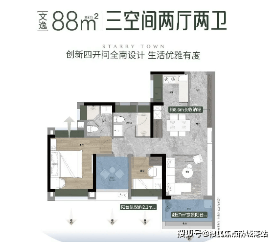 88㎡三房两卫:刚需爆款户型,罕见四面宽朝南,南向采光面超 11 米,三卧室均朝南,搭配精细化收纳系统(约 10 米收纳墙),满足三口之家首套需求,现楼总价约 246-262 万。