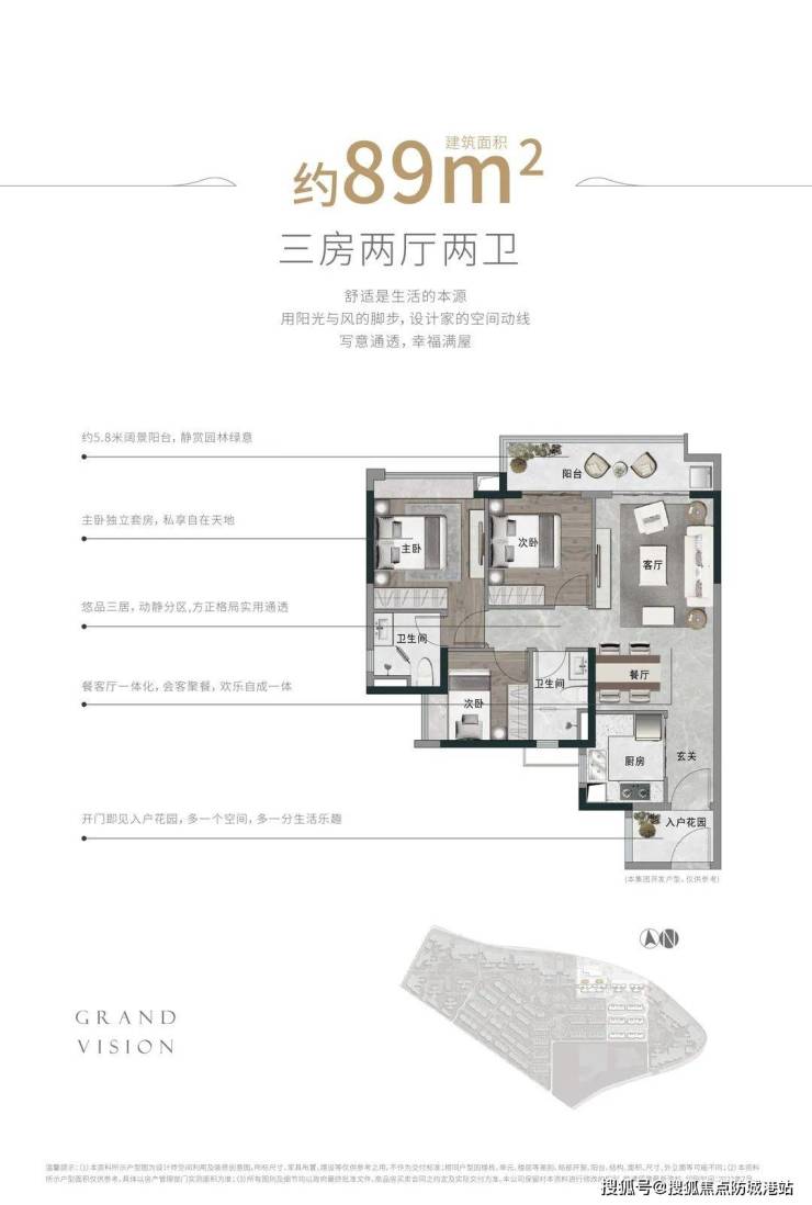 项目提供的三种主力户型——89㎡的三房两厅两卫、107㎡的舒适阳光三房以及128㎡的奢阔进阶大四房,均以宽敞明亮的空间布局和人性化的设计理念著称。每个户型都配备有宽大的阳台和主卧独立套房,旨在为住户创造一个温馨舒适的居住空间。