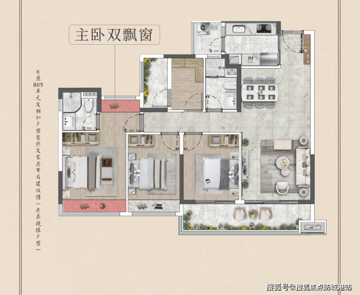 建面约134㎡五房两厅两卫:南北双阳台设计,主卧采用酒店式套房布局,彰显主人身份。