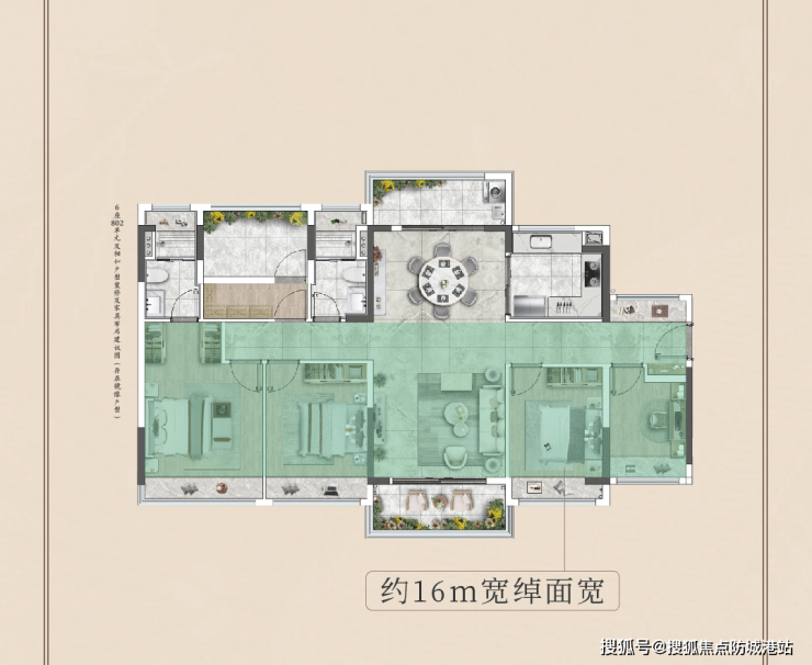 建面约115㎡四房两厅两卫:四开间朝南,客餐一体设计,搭配约6.6米宽的南向景观阳台。
