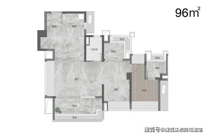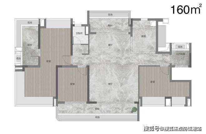 低区3-23层两梯四户,建面约95、120㎡户型;高区25-37层两梯三户,建面约135、160、195㎡户型。95㎡户型实测得房率120%,主卧270°飘窗可直视珠江;160㎡户型五开间朝南,一体化巨幕客厅面积达50㎡,南北双阳台设计。