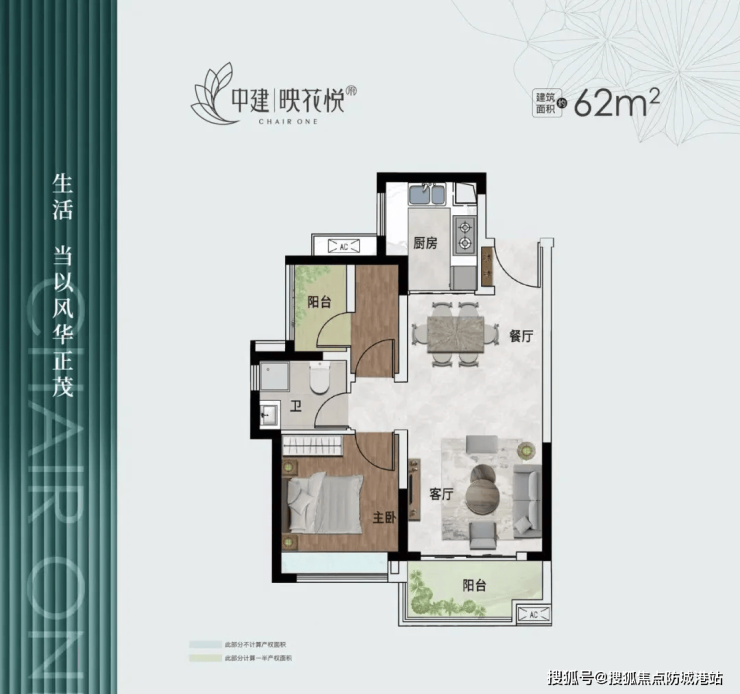 62平方米两房:适合单身或年轻夫妇,拥有3.3米宽的阳台和客厅,主卧朝南。