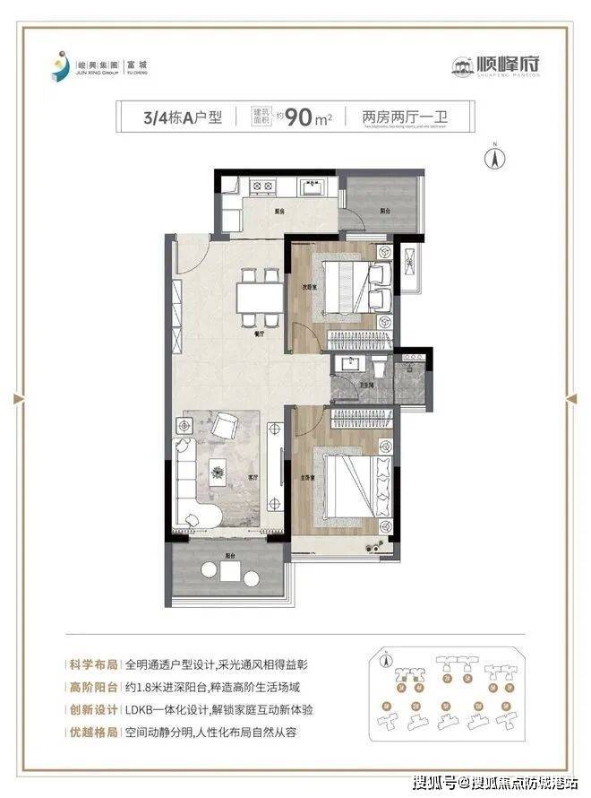 建面约90㎡户型:采用新颖的LDKB设计,全明通透,减少空间分割,实用性强。适合新婚夫妻或小家庭,提供宽敞明亮的居住环境。