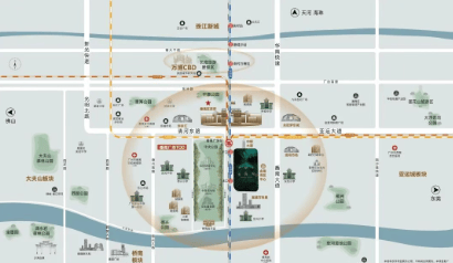 【绿城玉海棠】坐落在番禺广场的核心区域,紧邻地铁3号线、18号线及22号线的交汇点——番禺广场站。这一独特的地理位置使得居民能够轻松抵达广州的主要商务区如珠江新城、琶洲等,以及重要的交通枢纽广州南站。此外,自驾出行同样方便快捷,亚运大道、番禺大道等多条主要道路环绕四周。