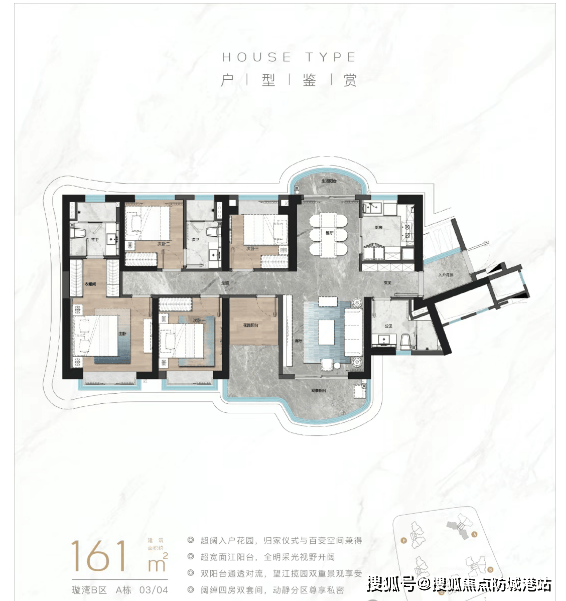 其中,建面约109㎡三房户型,是项目的高性价比之选,户型布局紧凑合理,空间利用率高,兼顾实用性与舒适性,适合刚需改善家庭,既能满足日常居住需求,又能享受滨江大城的全能配套;建面约135㎡四房户型,主打东南向滨江,采光通风俱佳,视野开阔,能最大限度享受江景资源,户型布局方正,动静分区明确,适合改善型家庭居住,满足全家居住的舒适需求;建面约161㎡五房户型,定位顶奢江景同堂户型,空间尺度阔绰,能满足多代同堂的居住需求,让家人各得其所,同时拥有极佳的江景视野,彰显高端人居品质;建面约253㎡一线滨江传世大平层,作为项目的顶级户型,拥有极致江景视野与阔绰空间尺度,270°环幕全景落地窗,将珠江美景尽收眼底,打造专属塔尖人士的尊贵居住体验。