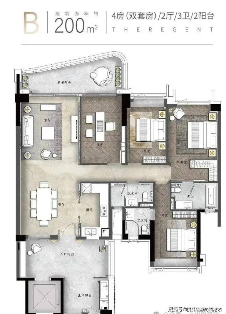 建面约200㎡:4房(双套房)2厅3卫2阳台私属电梯入户