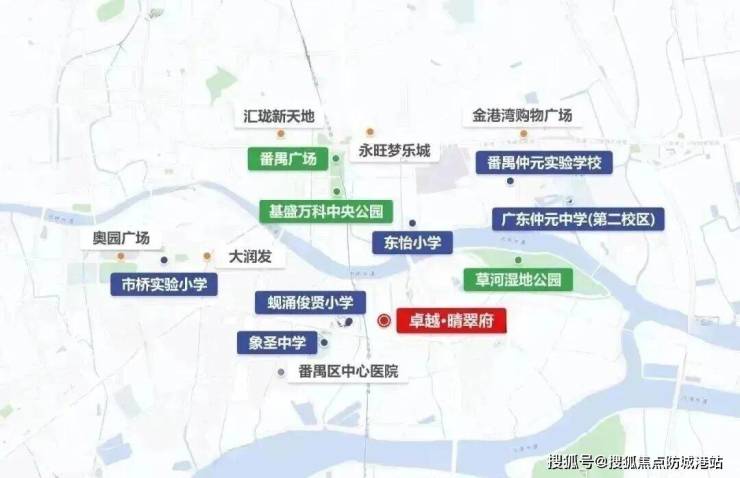 位于番禺区桥南板块,紧邻市桥河6公里精英河岸线,坐拥草河湿地公园、星海公园等四大滨水生态带。