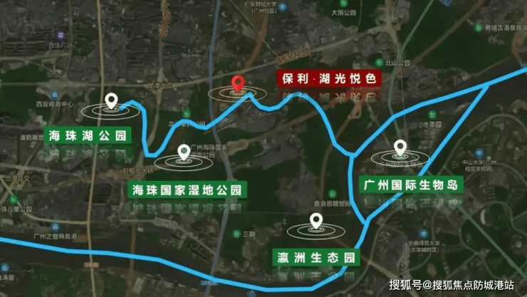 项目紧邻海珠国家湿地公园,直线距离仅 600 米,该公园总面积 1100 公顷,是广州中心城区最大的湿地公园,被誉为 “城市绿肺”。官方监测数据显示,公园周边区域空气质量优良率达 98%,负氧离子浓度为市区平均值的 5 倍,PM2.5 年均浓度低于 25μg/m³,生态环境得天独厚。此外,项目周边还有海珠湖公园、上涌果树公园等 5 大公园环绕,总绿化面积超 2000 公顷,形成 “一湖五园” 的生态格局。