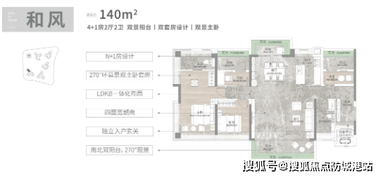 建面140平4+1房,主打高端改善,同样四开间朝南,南向采光面达到15.7米,采光效果极佳;南北双阳台设计,一边用于日常晾晒,一边用于休闲观景,功能分区明确;LDKB一体化设计,提升空间利用率,主套配置270度折叠屏飘窗,视野开阔,能够欣赏到周边自然美景,独立卫浴与衣帽间设计,彰显高端人居品质,适合多人口家庭或追求高品质生活的家庭居住。